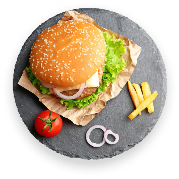 Приступайте к сборке бургеров. На половину булочек положите кольца лука и листья салата, потом котлету с овощами. Накройте оставшимися половинами булочек.