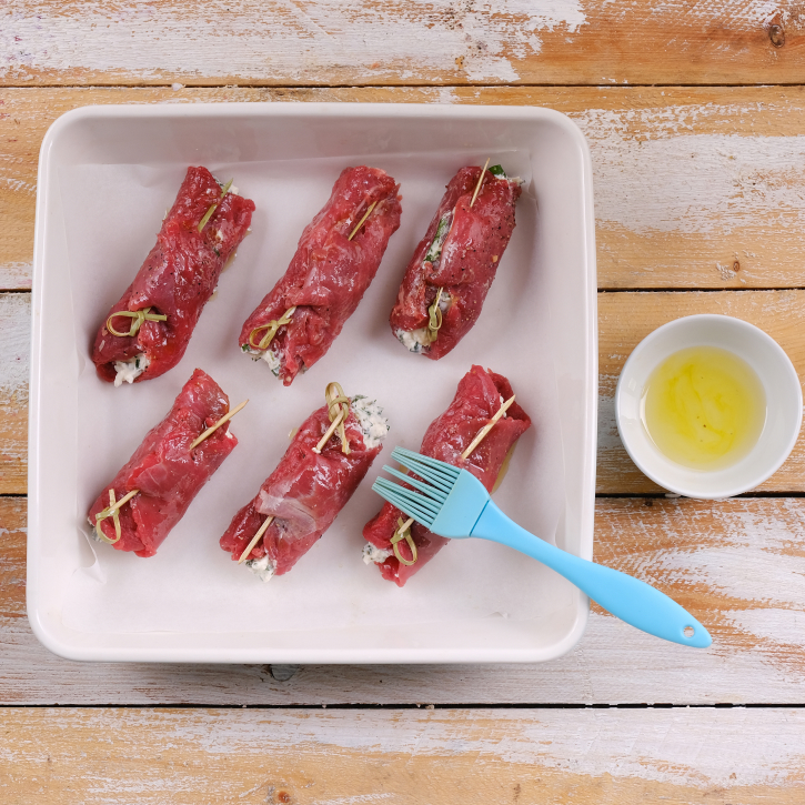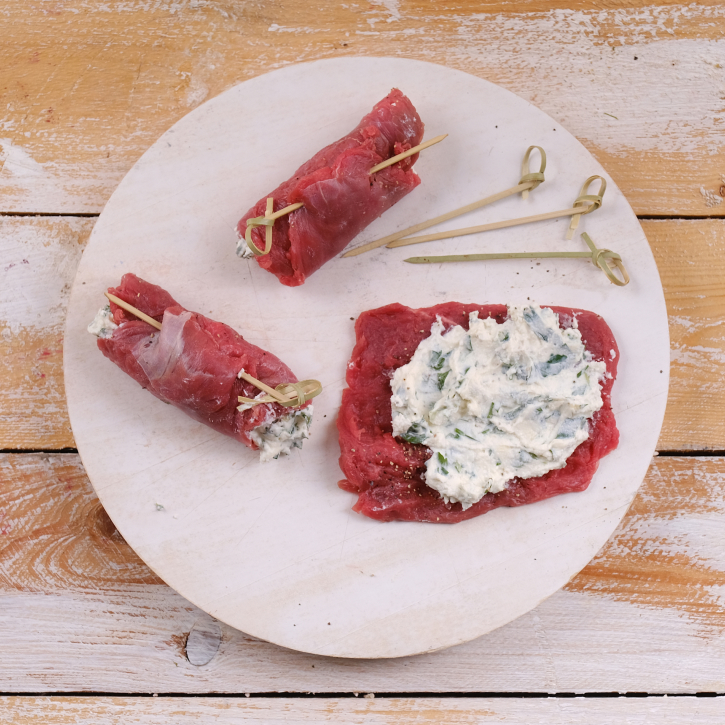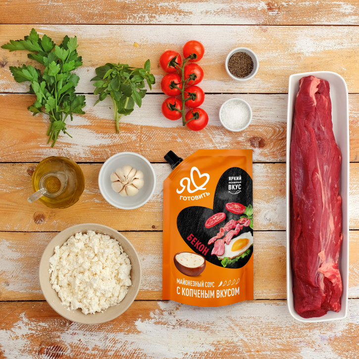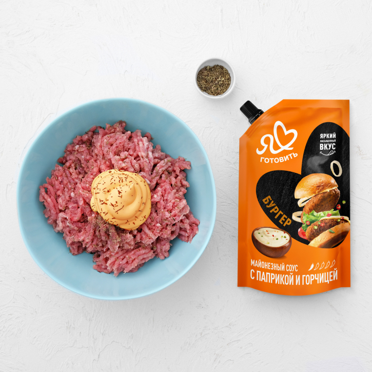 Смешайте фарш, 50 г Майонезного соуса «Я Люблю Готовить» Бургер с паприкой и горчицей и прованские травы.