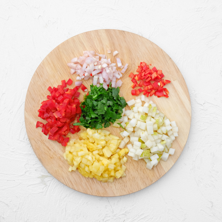 Для сальсы ананас нарежьте небольшими кубиками. Сладкий перец и перец чили разрежьте пополам, удалите семена и перегородки. Сладкий перец и лук-шалот нарежьте маленькими кубиками, чили и кинзу измельчите. Смешайте все подготовленные для сальсы ингредиенты. Приправьте солью, перцем и соком лайма. Перемешайте и оставьте при комнатной температуре до использования.