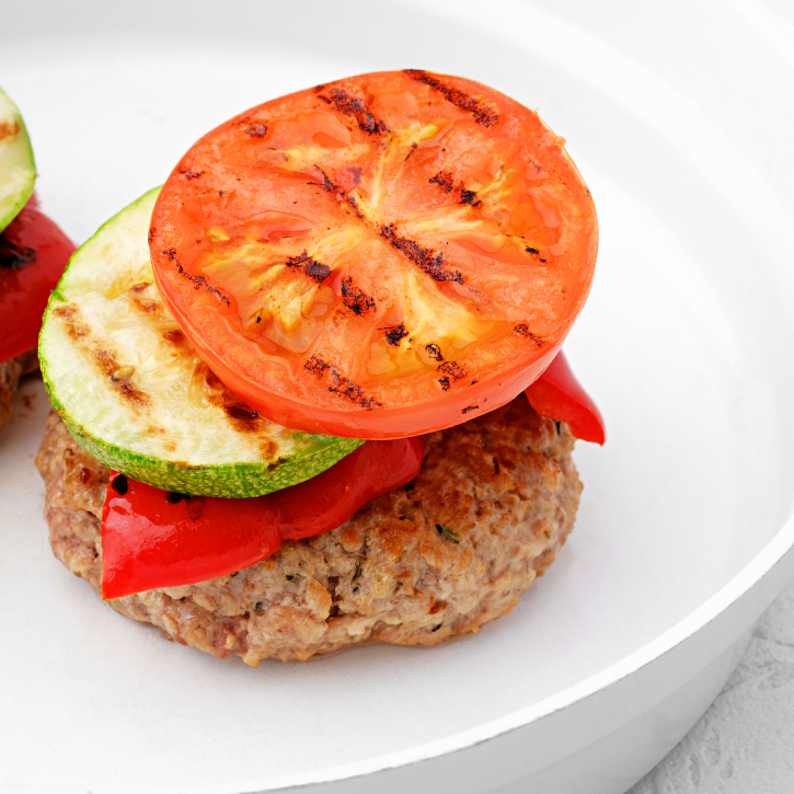 За 1 мин. до конца приготовления откройте крышку и положите на каждую котлету по 2 ломтика кабачка, 2 кусочка сладкого перца и по 1 кружку помидора.