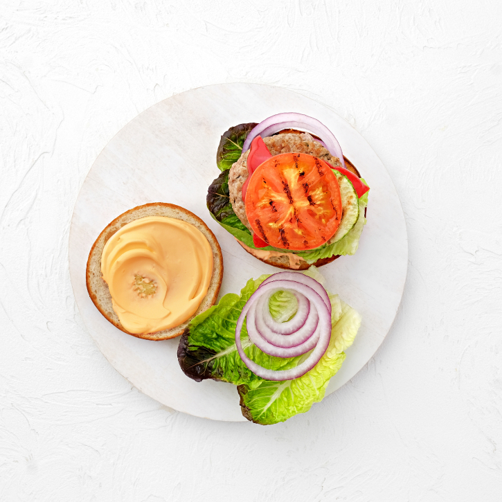 Одновременно на другой сковороде прогрейте половинки булочек. Снимите с огня и намажьте ровным и тонким слоем Майонезный соус «Я Люблю Готовить» Бургер с паприкой и горчицей со стороны среза.