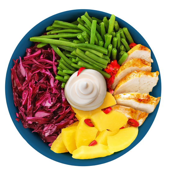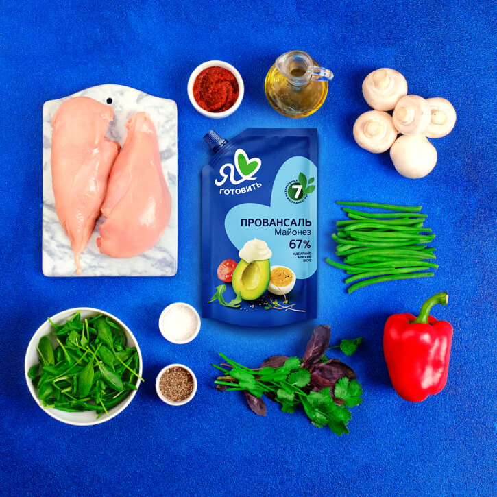 Курицу нарежьте средними кубиками и смешайте ее с фасолью, зеленью и сладким перцем. Заправьте все майонезом Провансаль «Я люблю готовить», смешанным с аджикой.