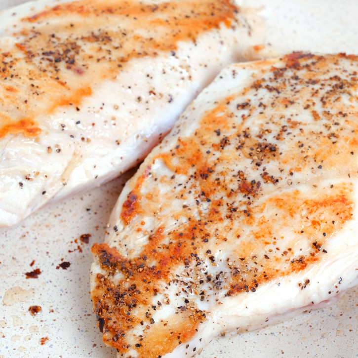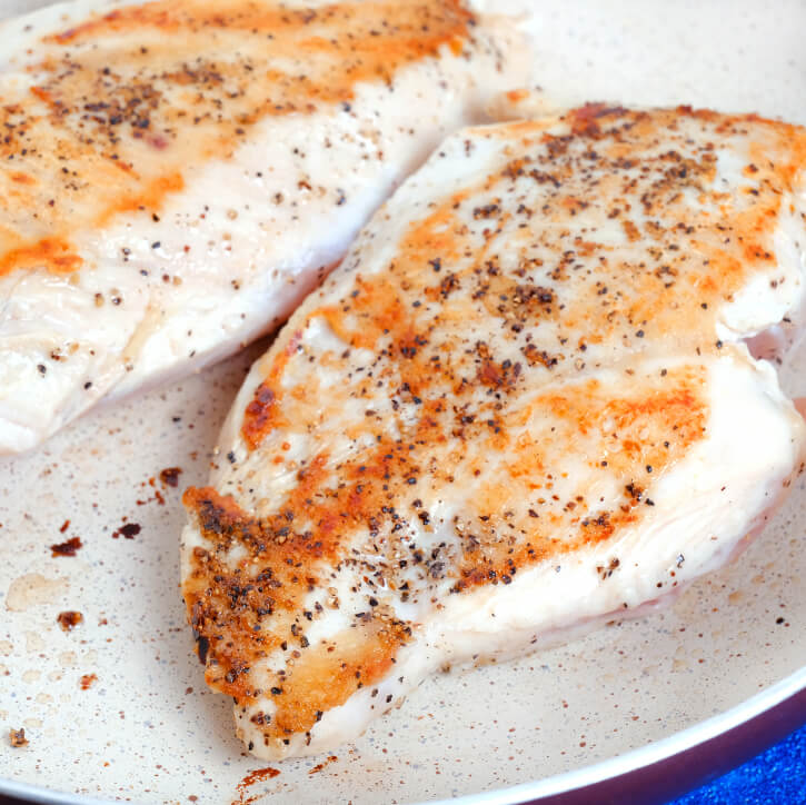 Посолите и поперчите курицу, обжарьте в 1 столовой ложке масла на среднем огне по 4 минуты с каждой стороны. Заверните в несколько слоев фольги и дайте остыть.