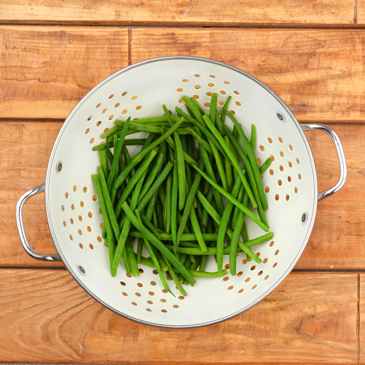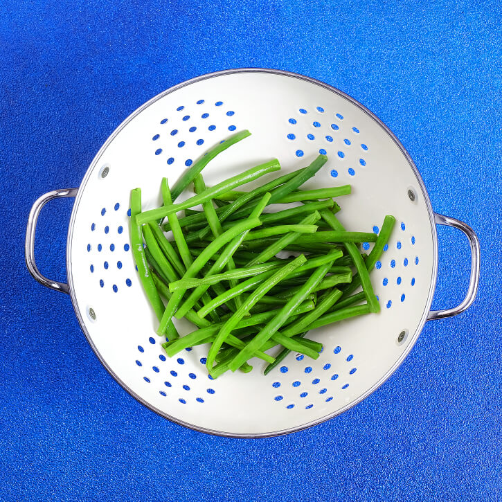 Отварите фасоль в слабокипящей воде в течение 2-3 минут. Откиньте на сито.