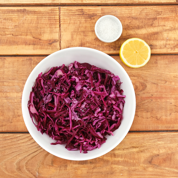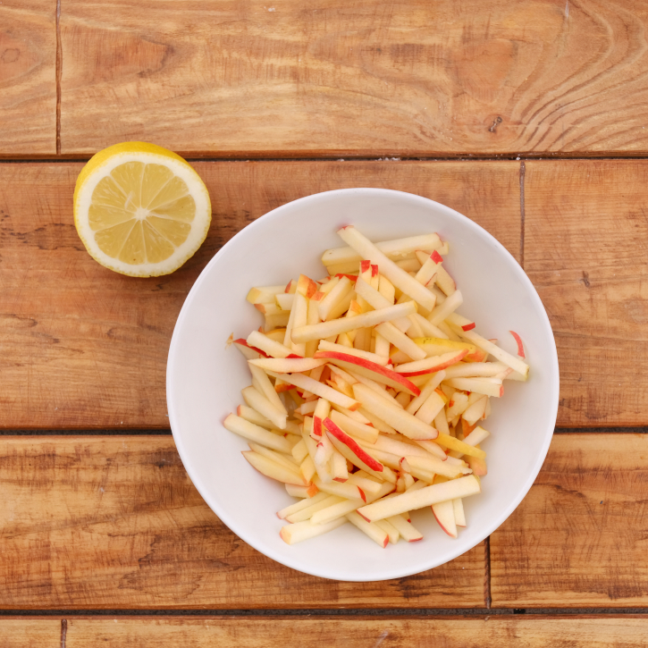 Яблоки разрежьте на четвертинки, не очищая от кожуры. Удалите сердцевину, мякоть нарежьте соломкой и полейте лимонным соком.