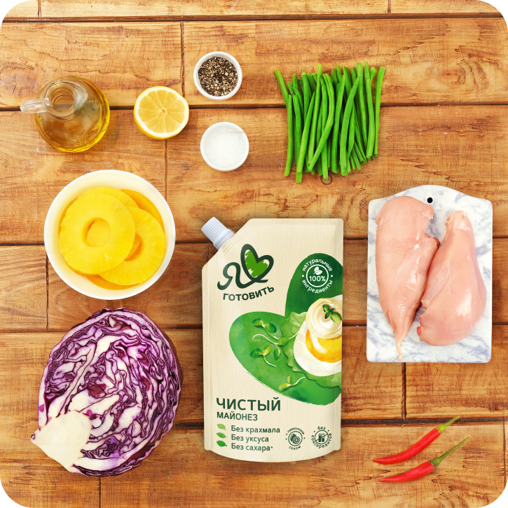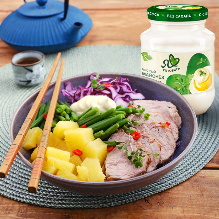 Для заправки смешайте Чистый майонез «Я люблю готовить» с арахисовой пастой до однородности.