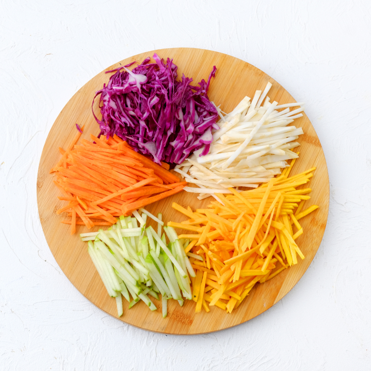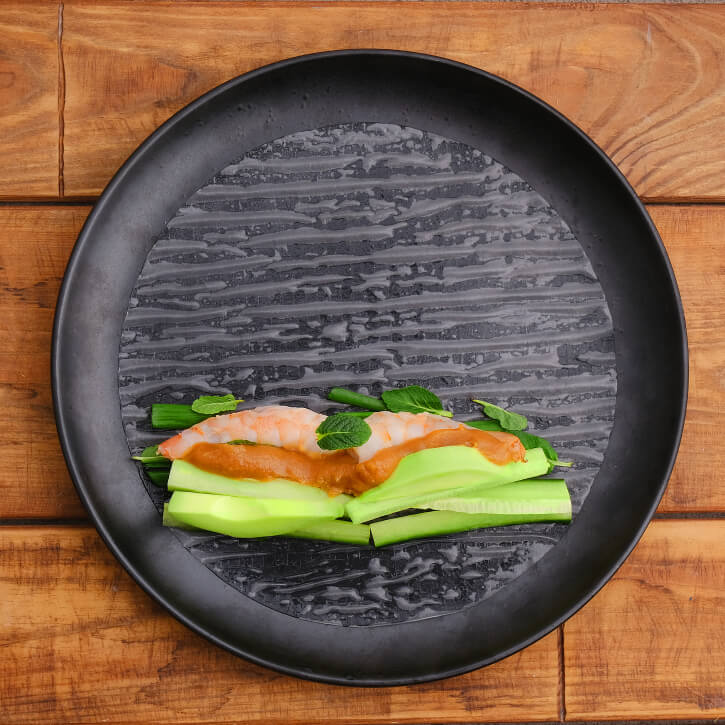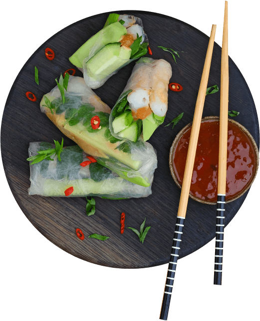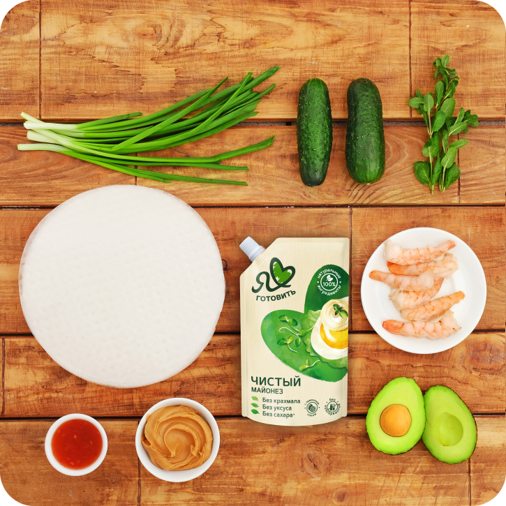 Окуните лист рисовой бумаги в теплую воду и положите на доску. На ближний край положите по 2–3 креветки и листья мяты или базилика. Сверху — по 2–3 кусочка зеленого лука, огурца и авокадо. Полейте заправкой из Чистого майонеза «Я люблю готовить» и арахисовой пасты, сверните рулетик, подгибая открытые боковые концы.