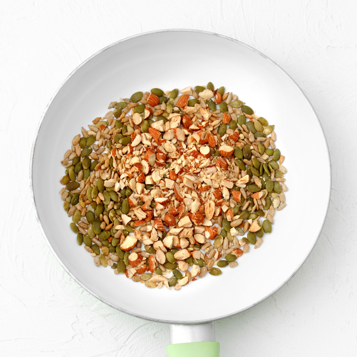 Семечки обжарьте на сухой сковородке, потряхивая её время от времени, 60–90 сек. В самом конце добавьте порубленные орехи.