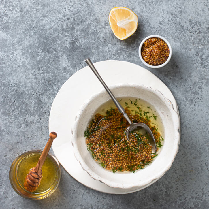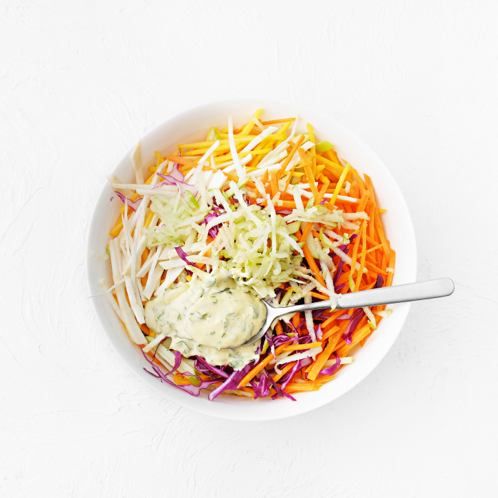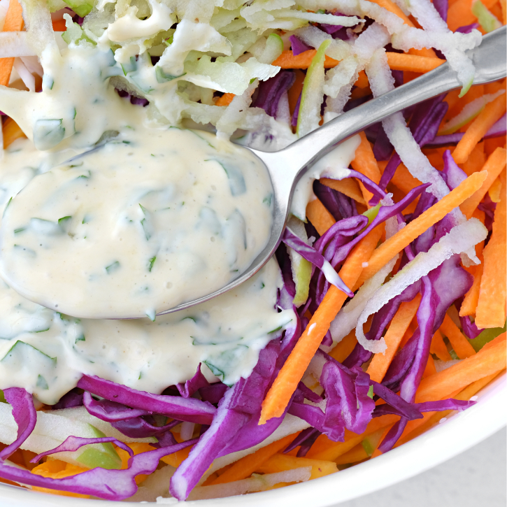 Взбейте все ингредиенты для соуса: петрушку, мед, соль, дижонскую горчицу и майонезный соус «Я Люблю Готовить» Коул-Слоу с Медовой горчицей.
