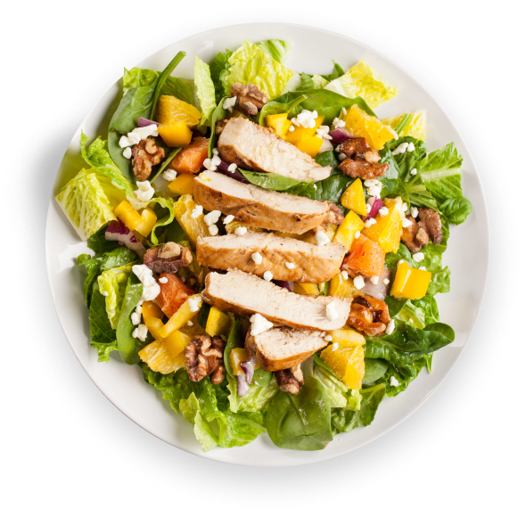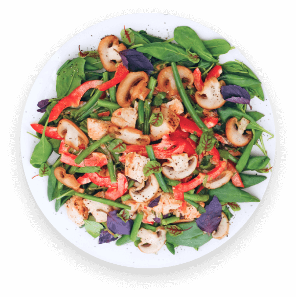 Разложите листья шпината на тарелки, сверху выложите салат, посыпьте грибами, поперчите, посолите по вкусу и подавайте на стол.