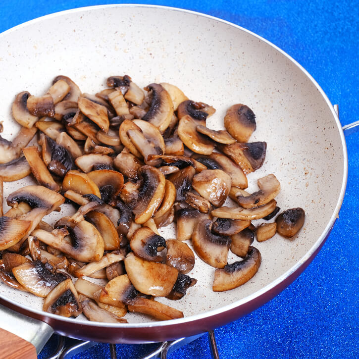 В сковороду, где жарилась курица, добавьте оставшееся масло и на сильном огне в течение 2-3 минут обжарьте нарезанные ломтиками грибы.