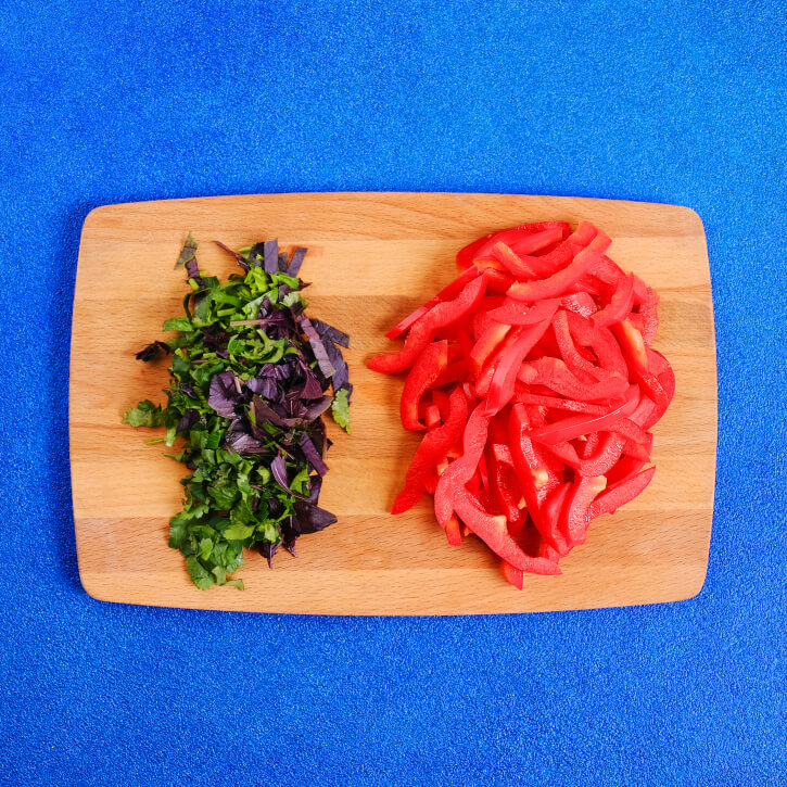 Измельчите зелень. Сладкий перец разрежьте на четвертинки, удалите плодоножку, семена и перегородки, мякоть нарежьте соломкой.