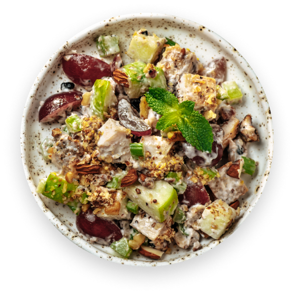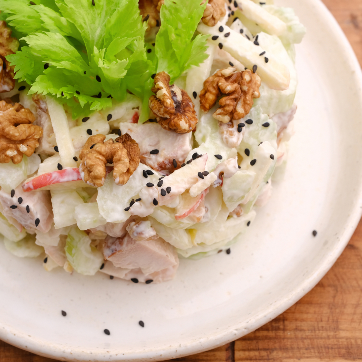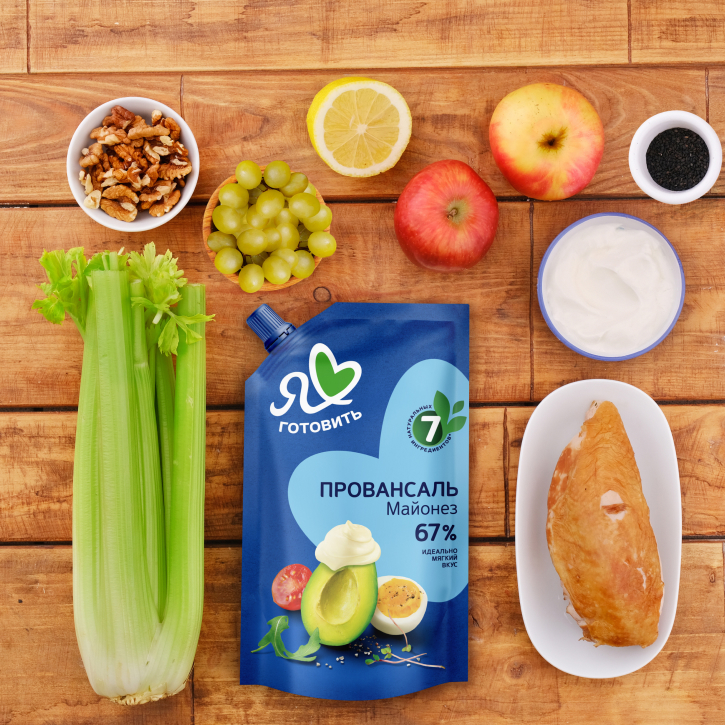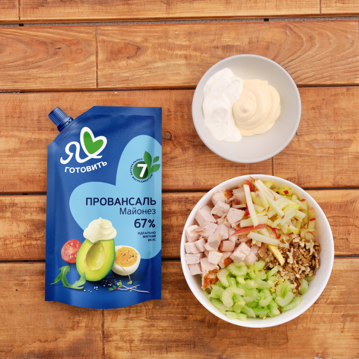 Для заправки смешайте майонез «Я Люблю Готовить» Классический провансаль с йогуртом и заправьте ею яблоки, сельдерей, куриную грудку и рубленые орехи. Все хорошо перемешайте.