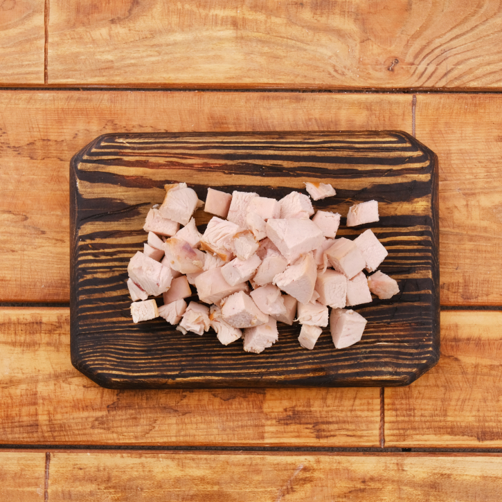 Куриную грудку разделайте: снимите мясо с кости, кожу удалите, мякоть нарежьте кубиками со стороной 1–1,5 см.