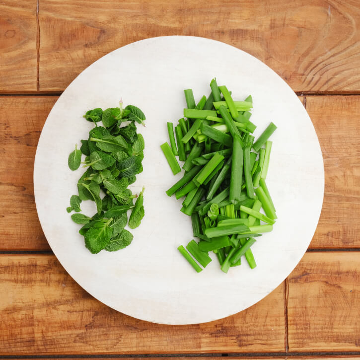 Зеленый лук нарежьте кусочками длиной 4 сантиметра. У мяты или базилика удалите стебли.