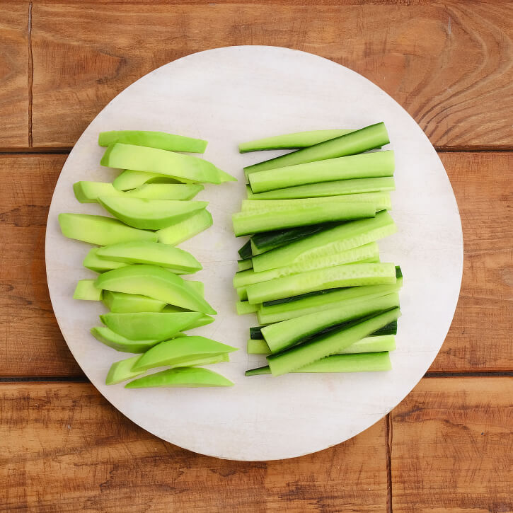 Нарежьте очищенный авокадо и огурец тонкими длинными ломтиками.