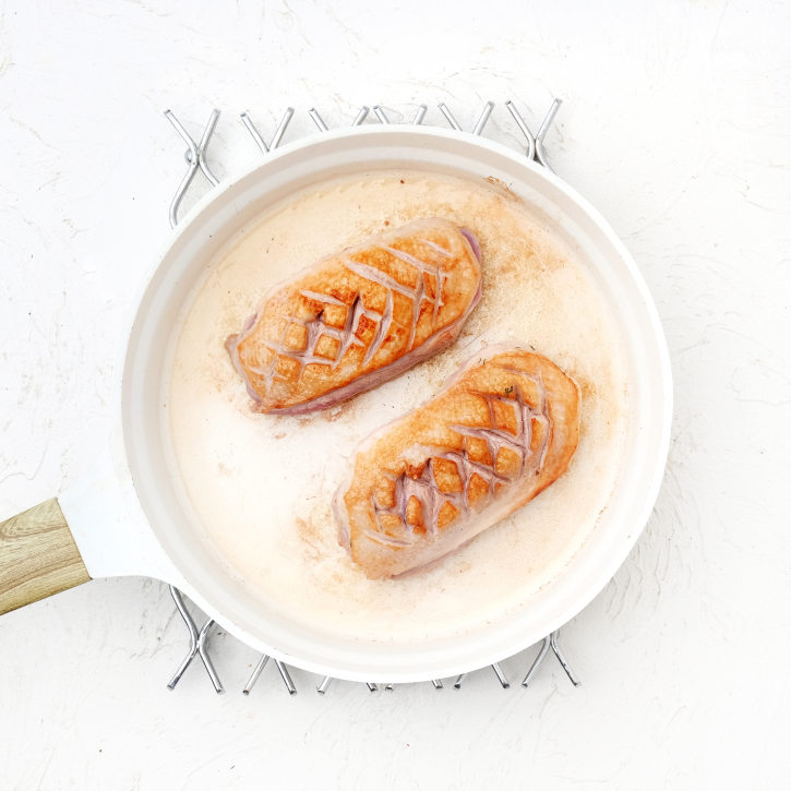 Переложите утиное филе на противень и доведите до готовности в духовке, разогретой до 160 °С, 10 мин.