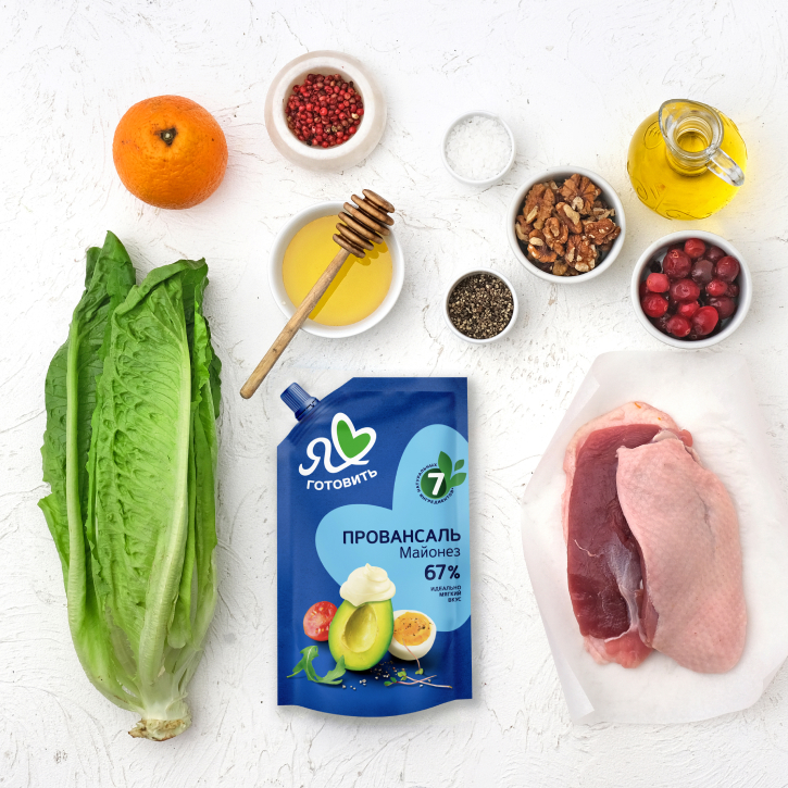 В блендере измельчите 2 ст. л. клюквы в пюре, добавьте мед и майонез «Я Люблю Готовить» Классический провансаль, взбейте до однородности. Если нужно, немного посолите и поперчите заправку.