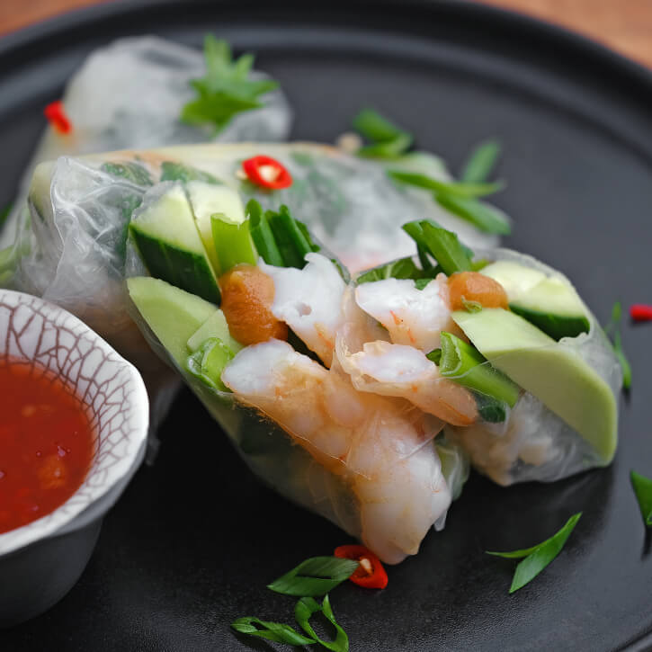 Окуните лист рисовой бумаги в теплую воду и положите на доску. На ближний край положите по 2–3 креветки и листья мяты или базилика. Сверху — по 2–3 кусочка зеленого лука, огурца и авокадо. Полейте заправкой из Чистого майонеза «Я люблю готовить» и арахисовой пасты, сверните рулетик, подгибая открытые боковые концы.