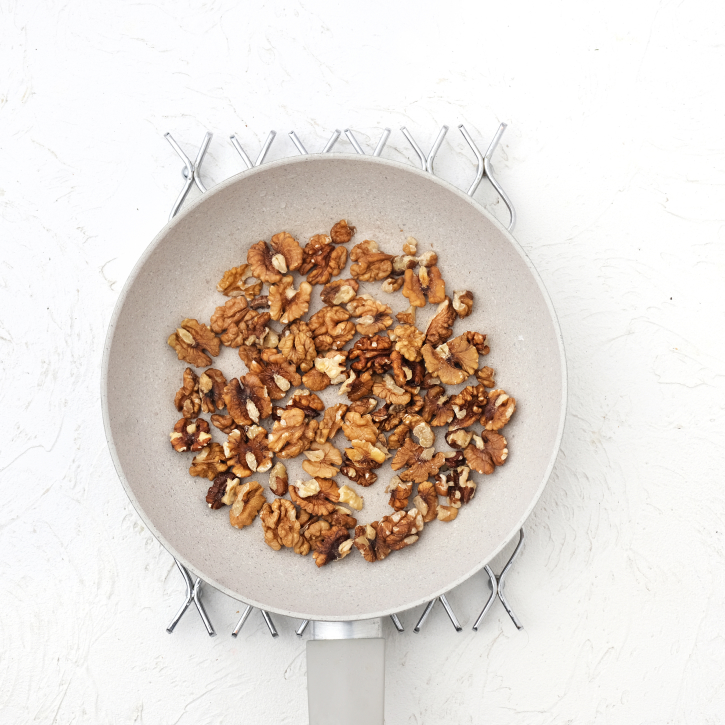 Обжарьте грецкие орехи для салата на сухой сковороде, 2 мин.